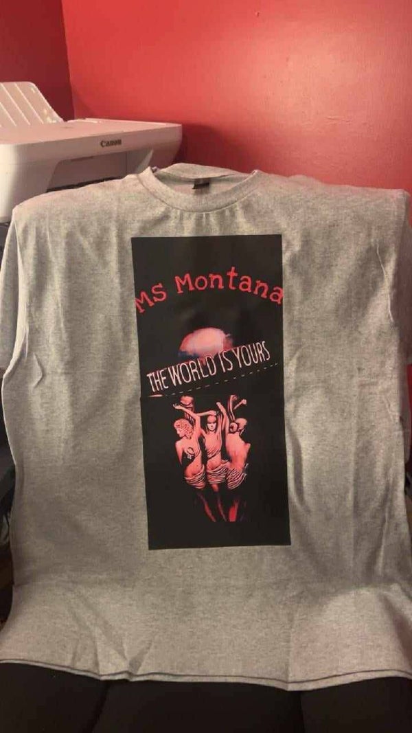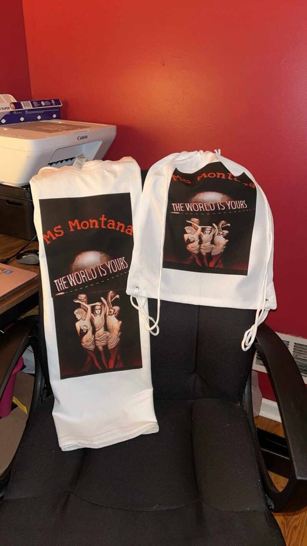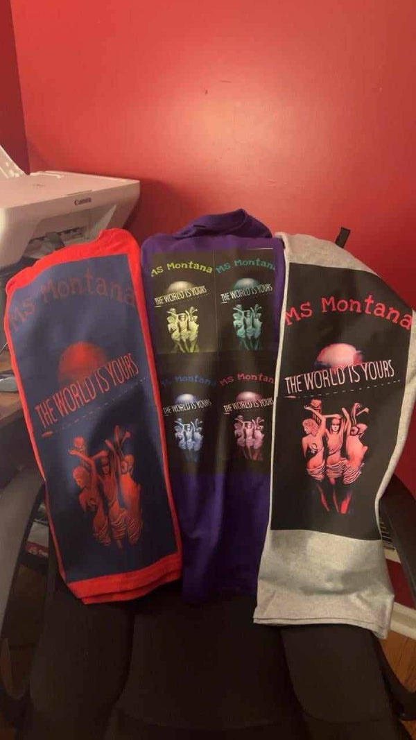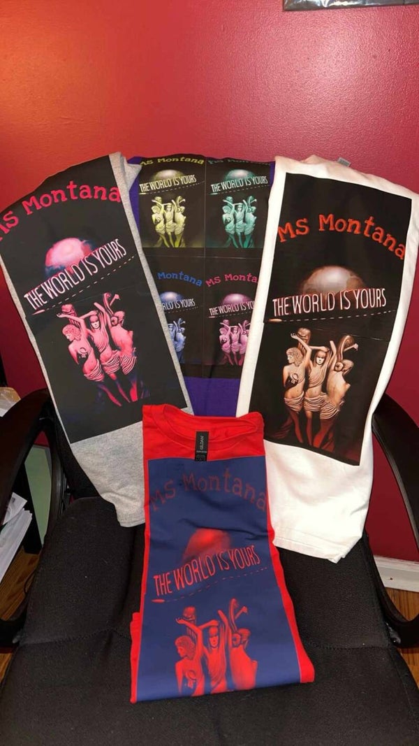 The Ms Montana "the world is yours" come in all colors shirts $20 $15 bags motion pictures manuscripts are negotiable...